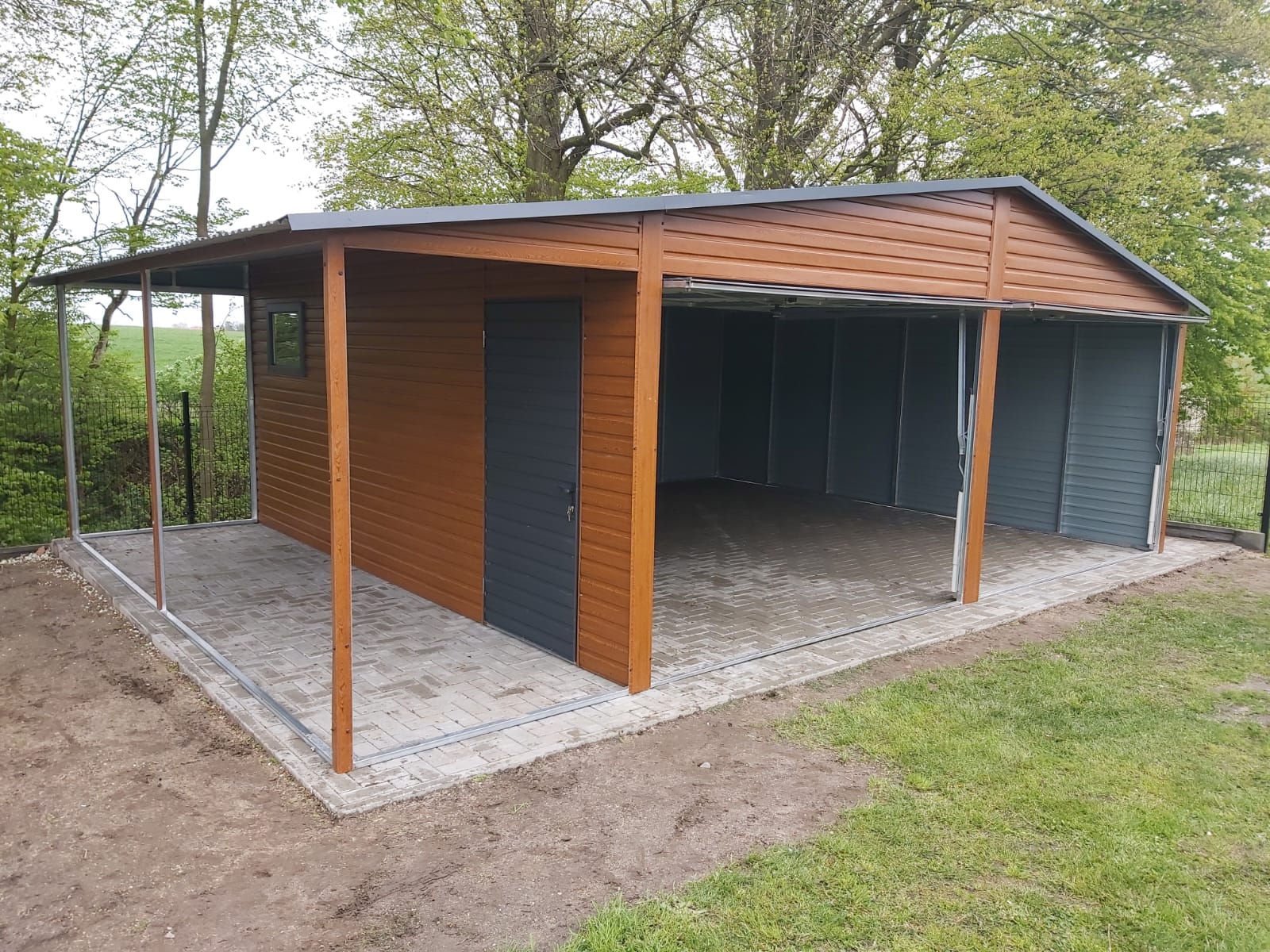 – dwie bramy uchylne, na bramach trapez poziomy, szeroki 17 cm, w kolorze grafitowy
