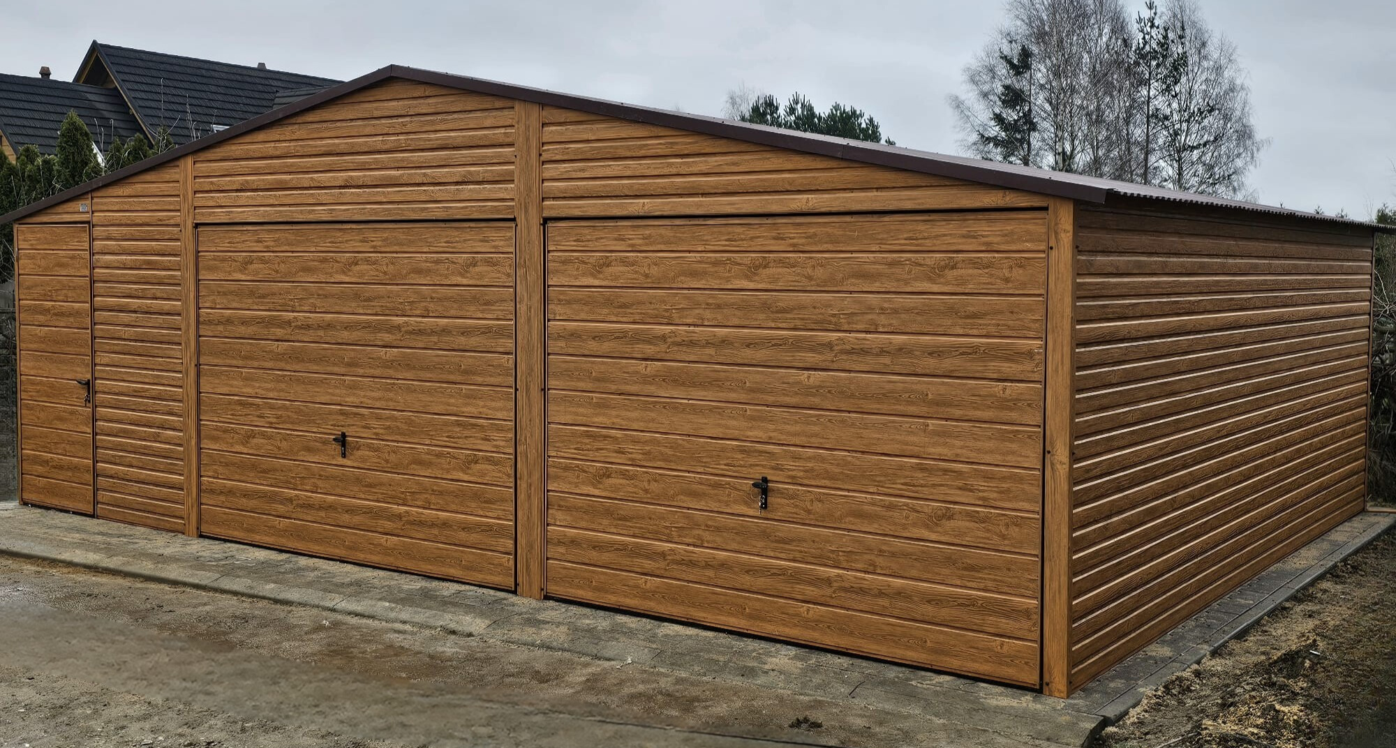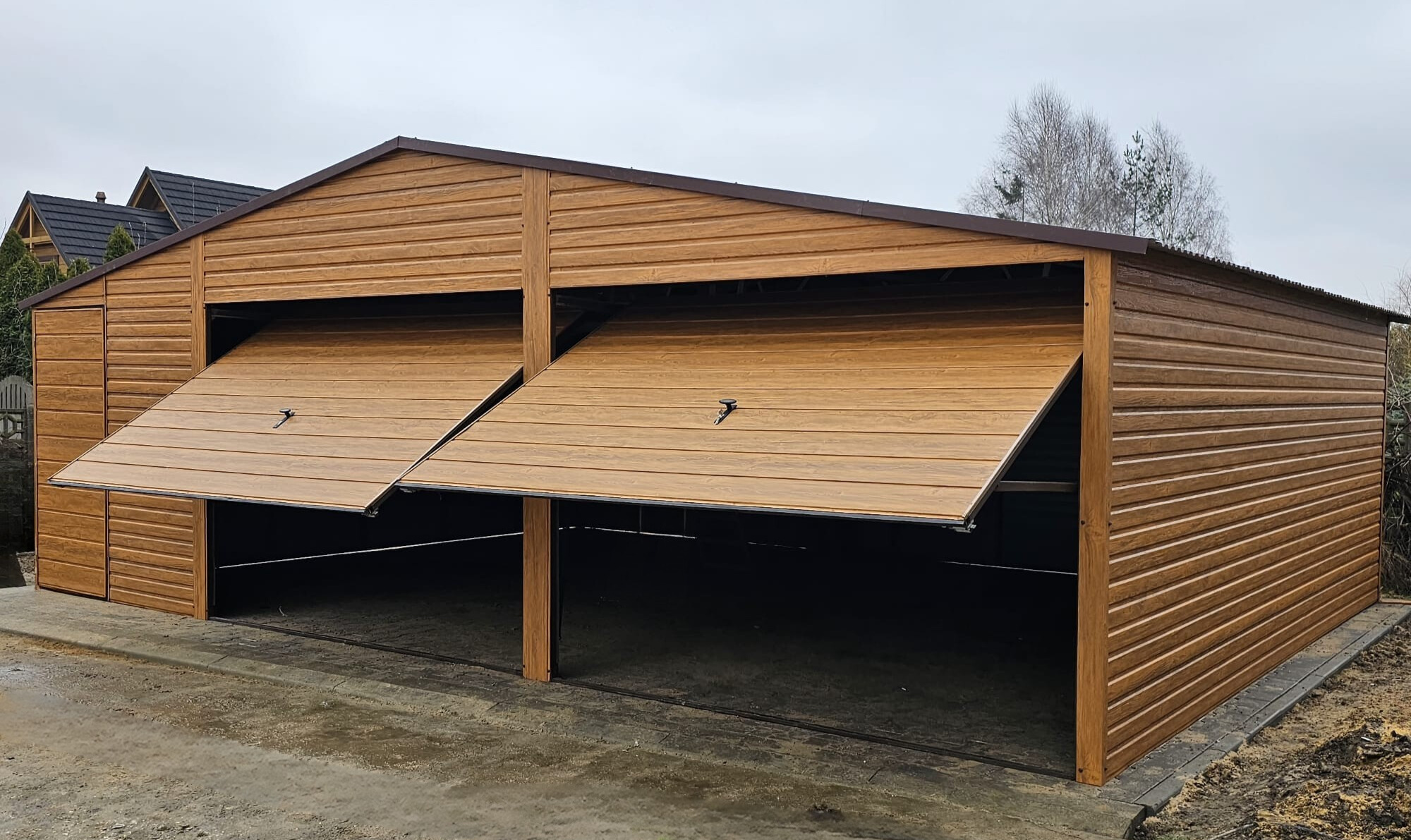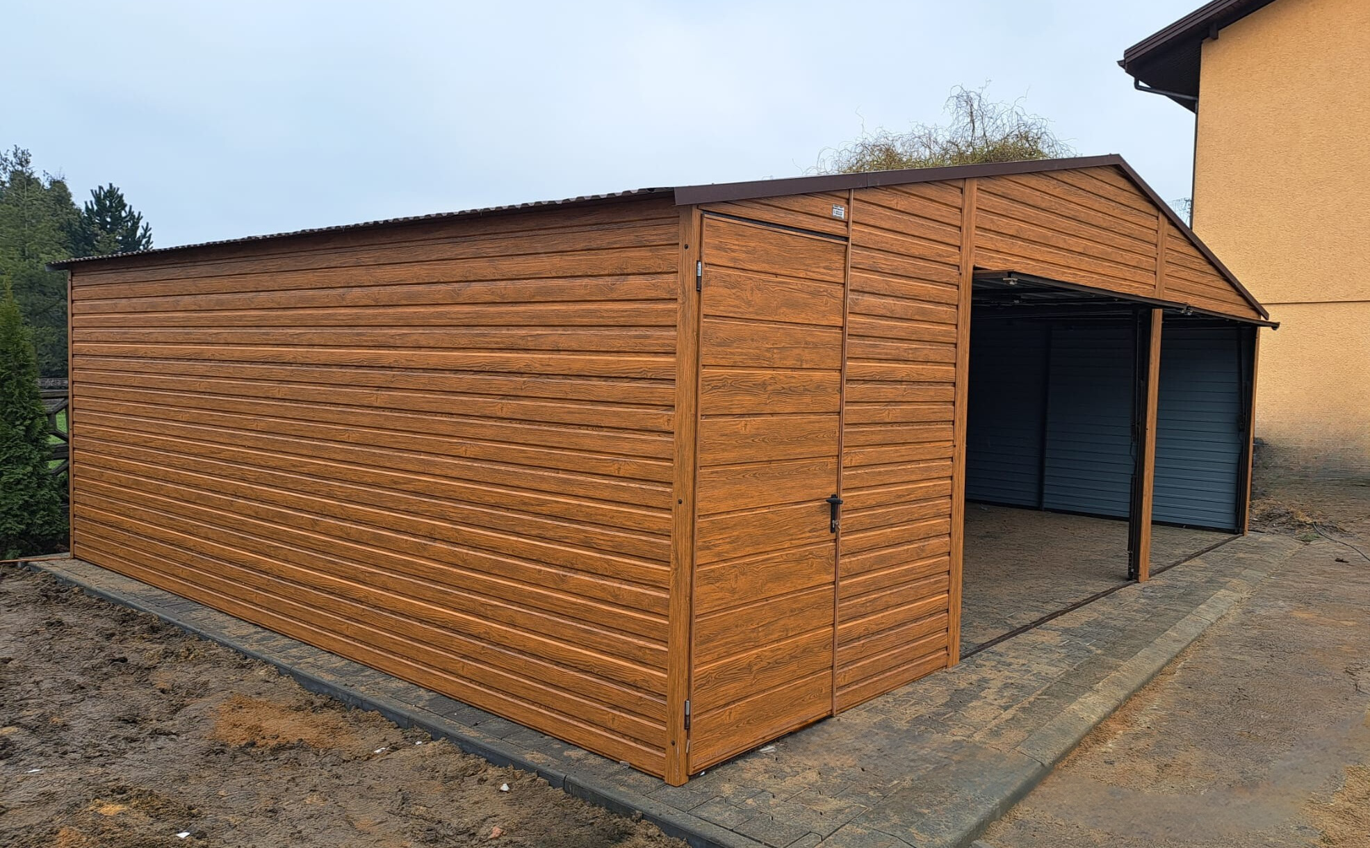 – kolor ścian garażu drewnopodobny / złoty dąb